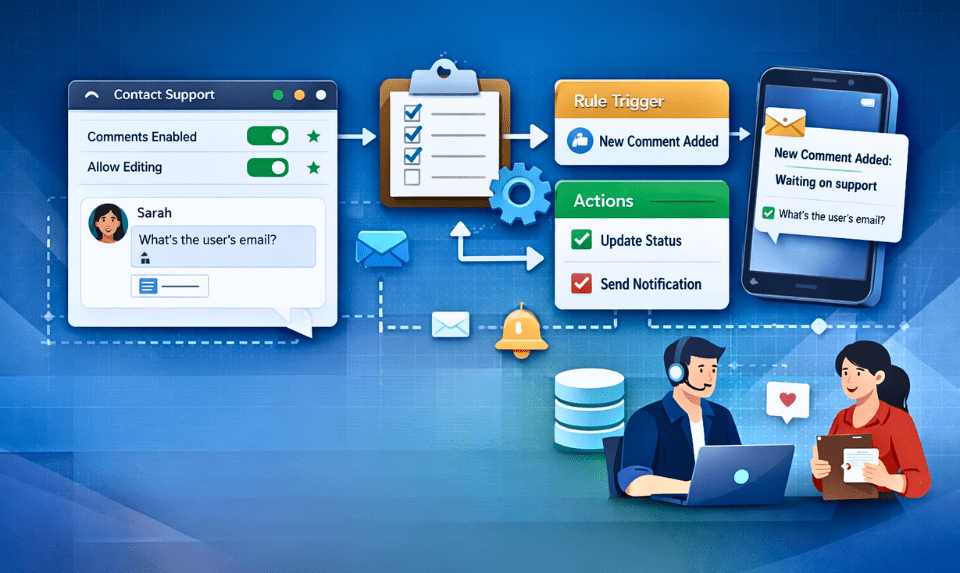 Custom rules and operations can also be configured to respond to new comments, such as updating the status of a case, or sending an email or alert notification.